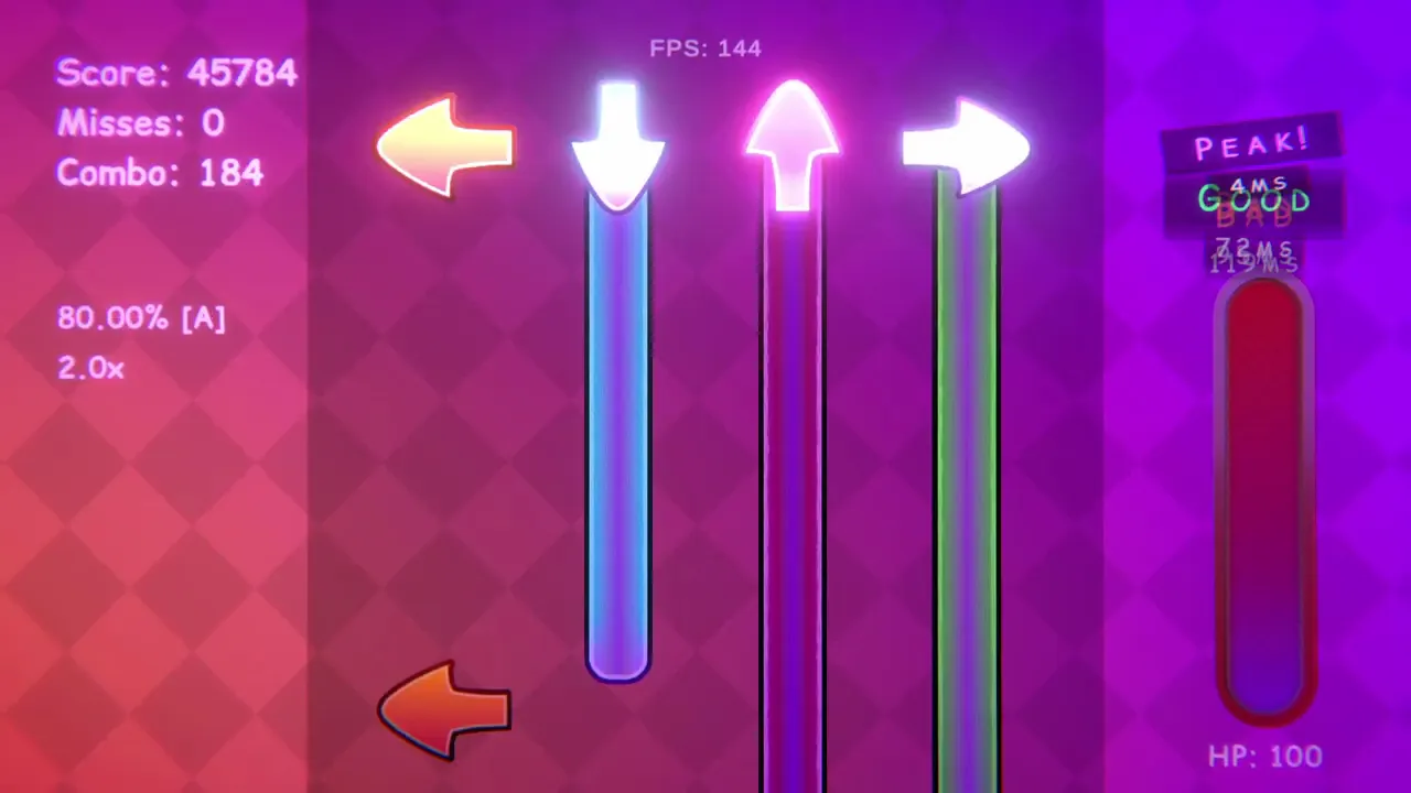 The goal is to play through all of the self made songs while arrows (notes) float towards you and miss as little of them as possible.